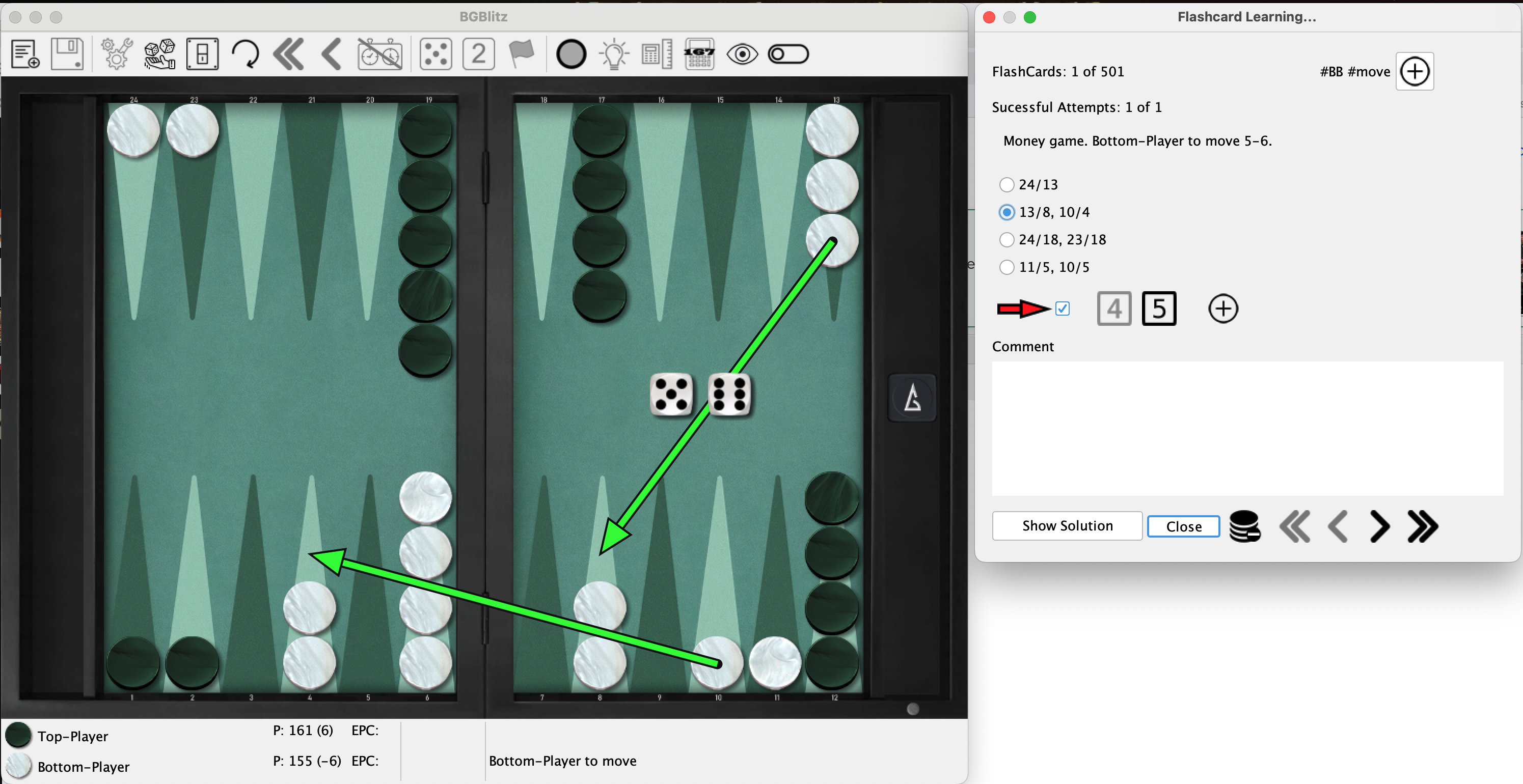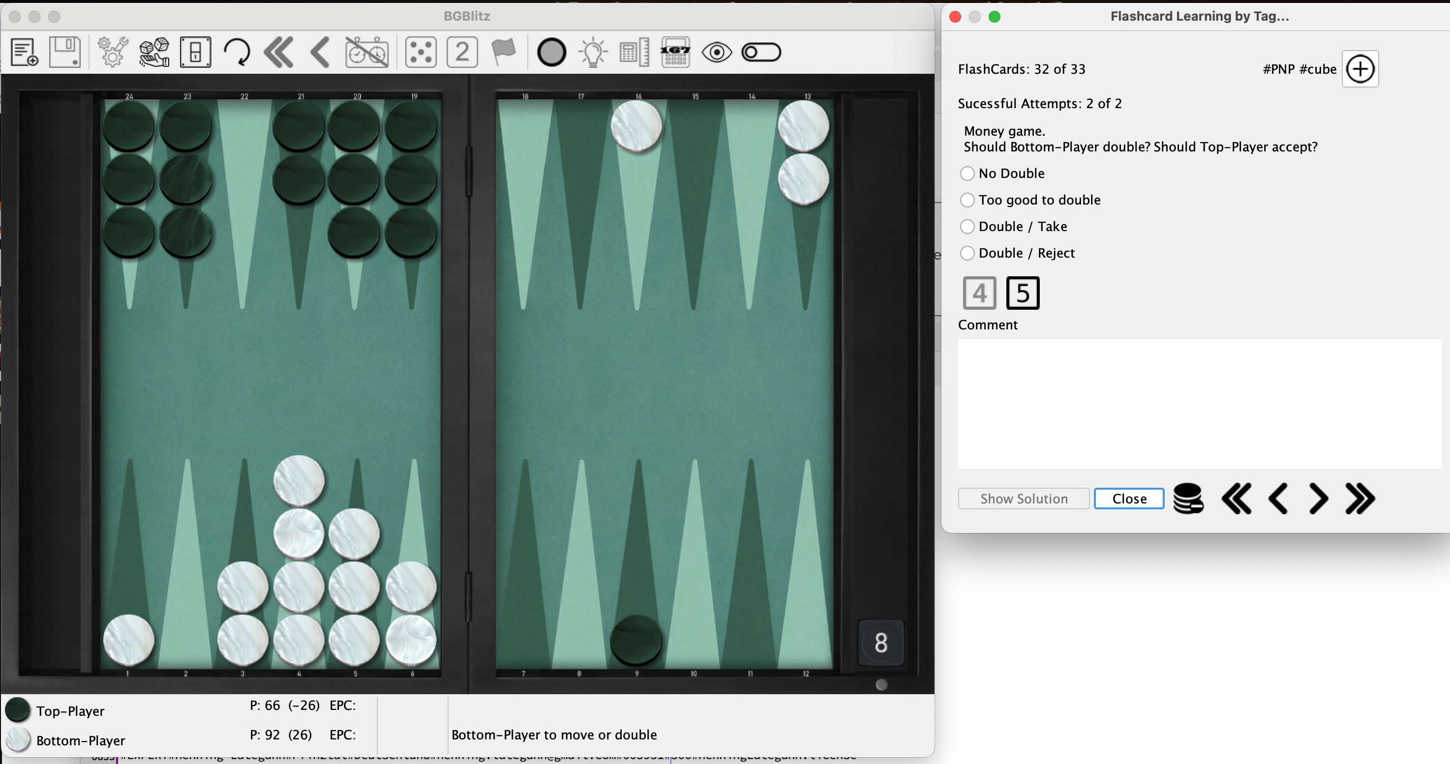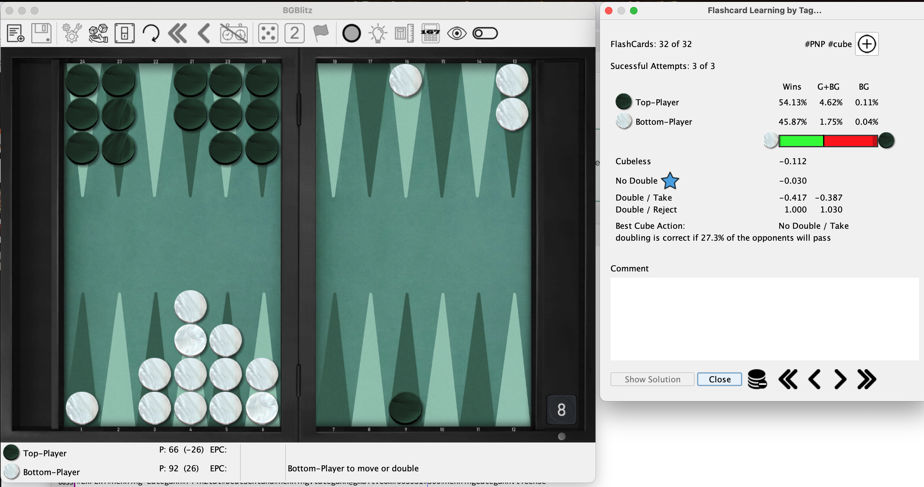 So how does the generation work? You can simply generate flash cards under "Best Moves" or "Position Evaluation" in the action menu, just as you can easily generate a card with the XGID in the "Performance Coach" menu. The most common way is probably via the Analyzer.
