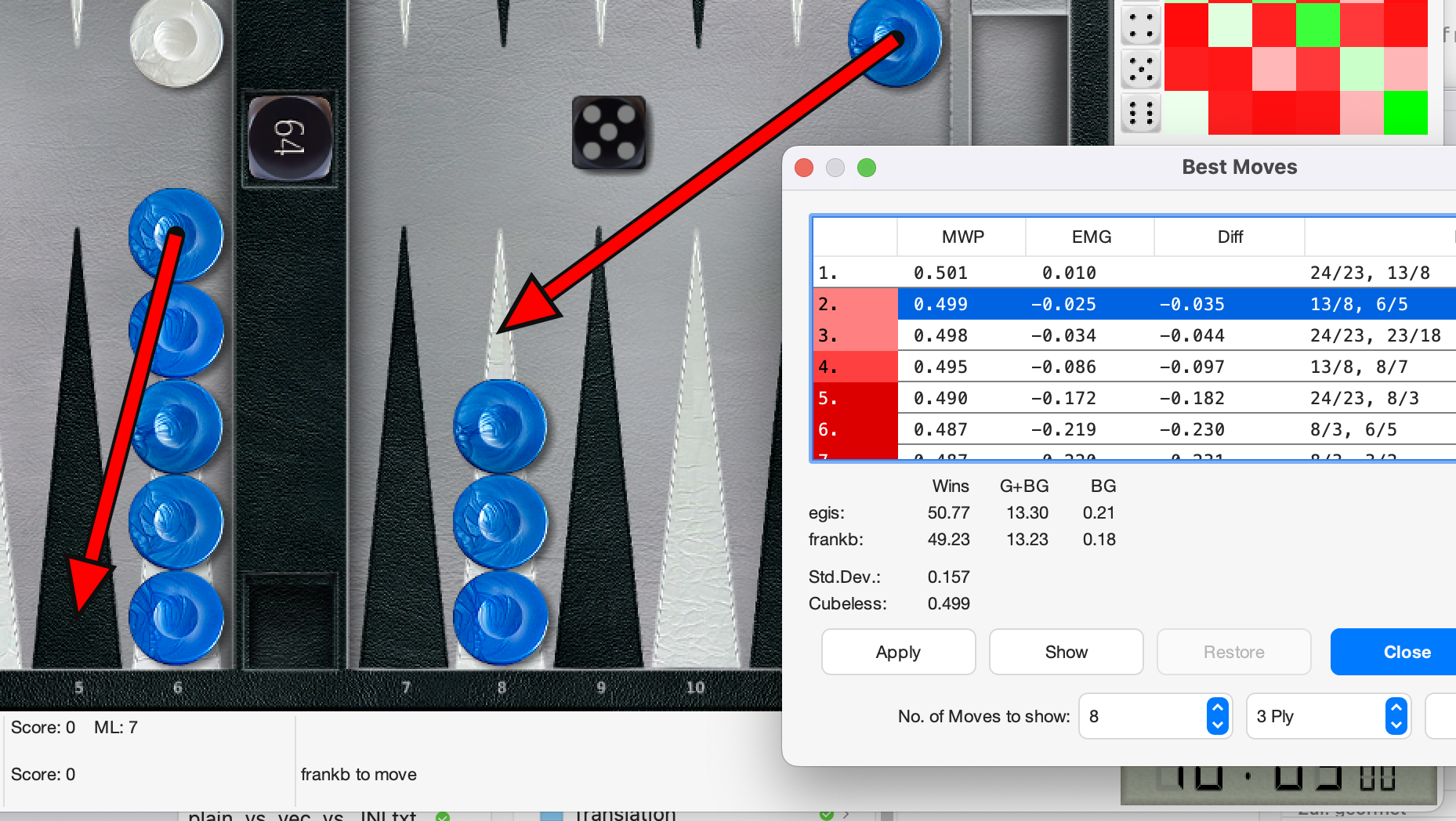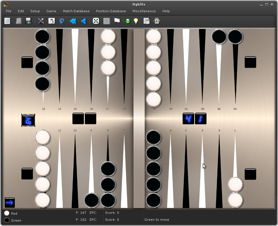 - GnuBG (wenn installiert) kann als KI in BGBlitz auf die gleiche Weise wie TachiAI verwendet werden. Warum habe ich GnuBG eingebaut? Wenn Sie sich die Situation bei Schach oder Go ansehen, haben Sie eine blühende Szene von KIs. Warum ist das bei Backgammon nicht der Fall? Die kleinere Community ist sicher ein Grund, aber stellen Sie sich vor, Sie schreiben eine Top-Backgammon-KI .... und jetzt? Sie müssen weitere 5-10 Jahre investieren, um ein vollständiges Programm zu bekommen. Backgammon fehlt ein Plugin-Mechanismus. Im Schach können Sie nicht nur die führende KI Stockfish in Fritz oder Shredder einbinden, Stockfish hat überhaupt keine Benutzeroberfläche! Wir haben so etwas nicht. BGBlitz war immer dafür gedacht, Plugins zu unterstützen (das ist der Grund, warum die KI von BGBlitz ihren eigenen Namen TachiAI hat). Ich habe die Idee der internen Plugins vor einigen Jahren fallen gelassen und ich habe versucht, GnuBG als externe KI einzubinden. Es ist ein Proof of Concept, dass eine externe KI funktioniert und BGBlitz unterstützt somit bereits zwei der aktuell relevanten KIs. Wenn mich jemand kontaktiert, werde ich eine API für den allgemeinen Gebrauch zur Verfügung stellen. BTW, da ich GnuBG in keiner Weise einbinde, sondern nur eine installierte Version verwende, sehe ich keine Lizenzprobleme. GnuBG kann in BGBlitz auf Windows, Linux und MacOS verwendet werden (auf MacOS muss man es mit macports installieren)