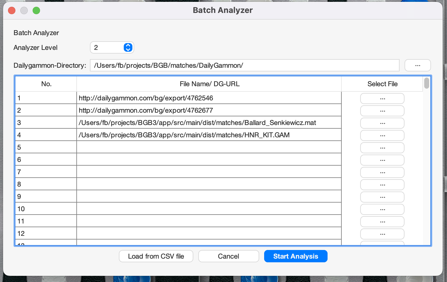 - Wenn Sie einen ganzen Stapel von Spielen analysieren wollen, entweder Dateien oder Links von Dailygammon, haben Sie jetzt die "Batch Analyse". Geben Sie einfach die Dateinamen oder URLS ein oder stellen Sie eine csv-Datei zur Verfügung und alle werden in einem Rutsch analysiert. Sie finden sie unter "Datei / Analyse / Batch-Analyse".