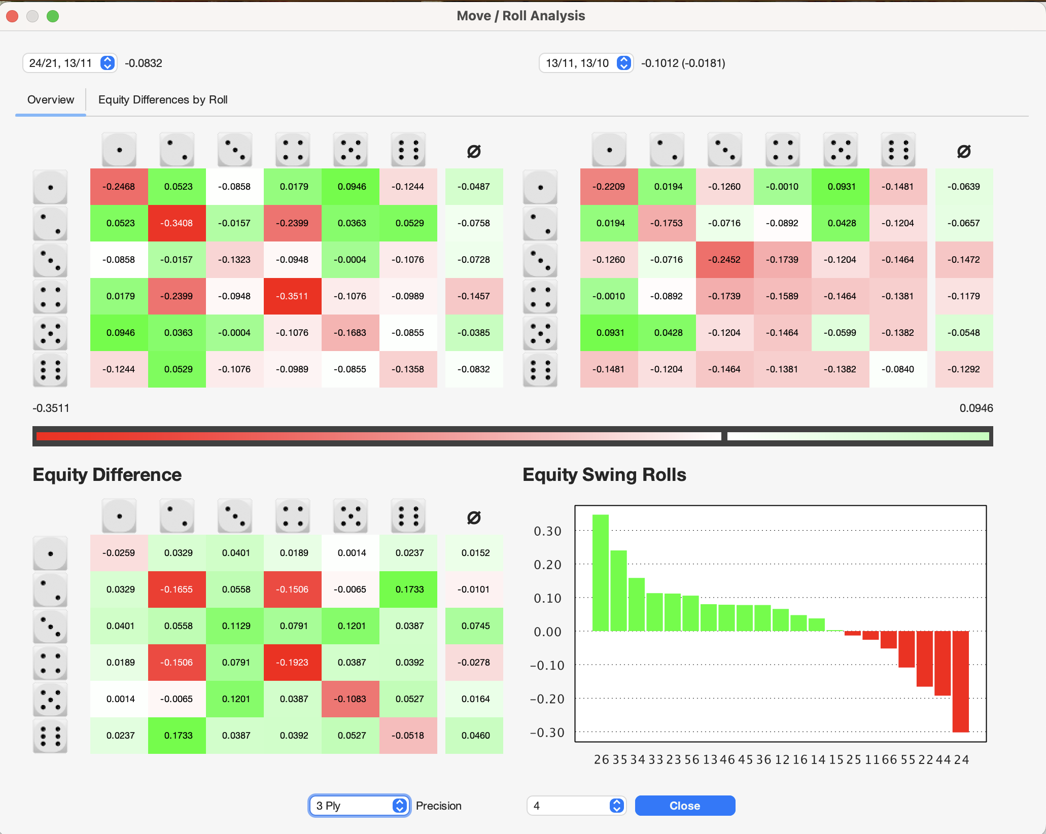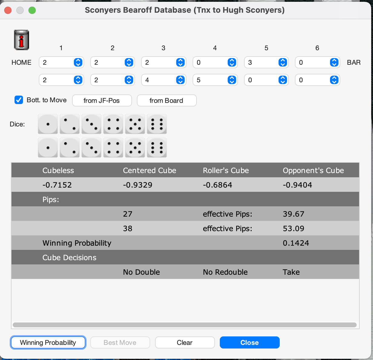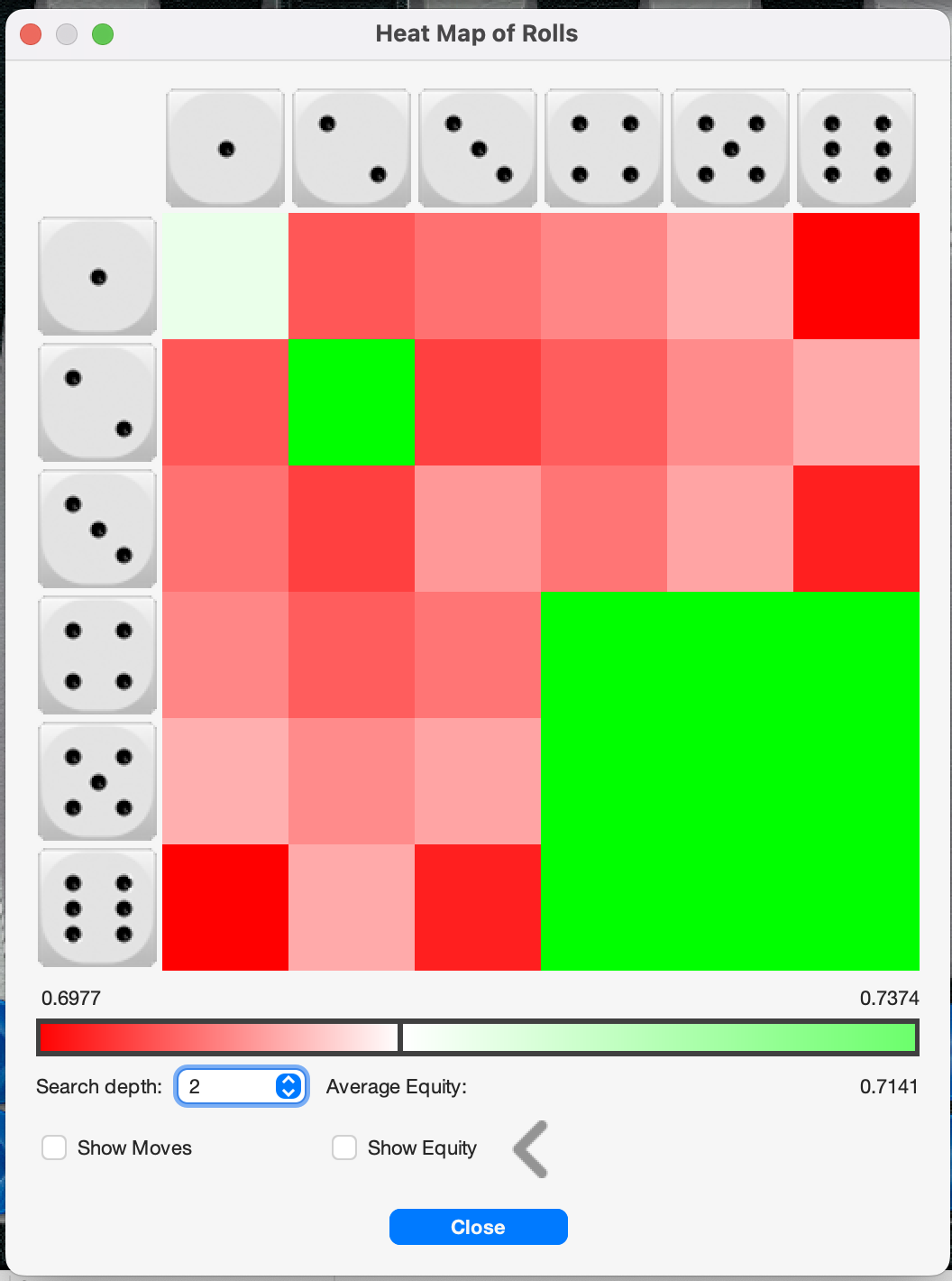 - Ich habe eine Dialogbox hinzugefügt, die die "Early/Late-Doubling"-Werte anzeigt und der "Doubling Strategy Dialog" unterstützt nun cubeful Equities und eine einstellbare Cube Liveness