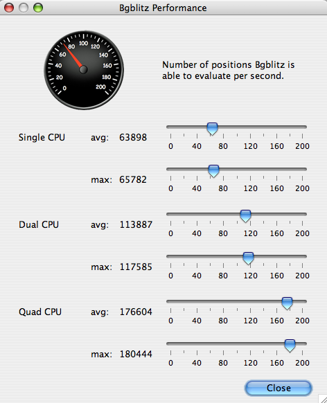 - BGBlitz skaliert besser auf CPUs mit vielen Kernen. Bei 12 Kernen können, je nach CPU, bis zu 80% mehr Positionen pro Sekunde ausgewertet werden!